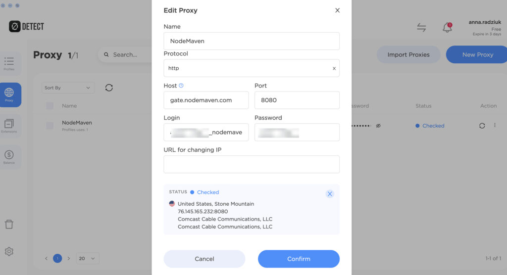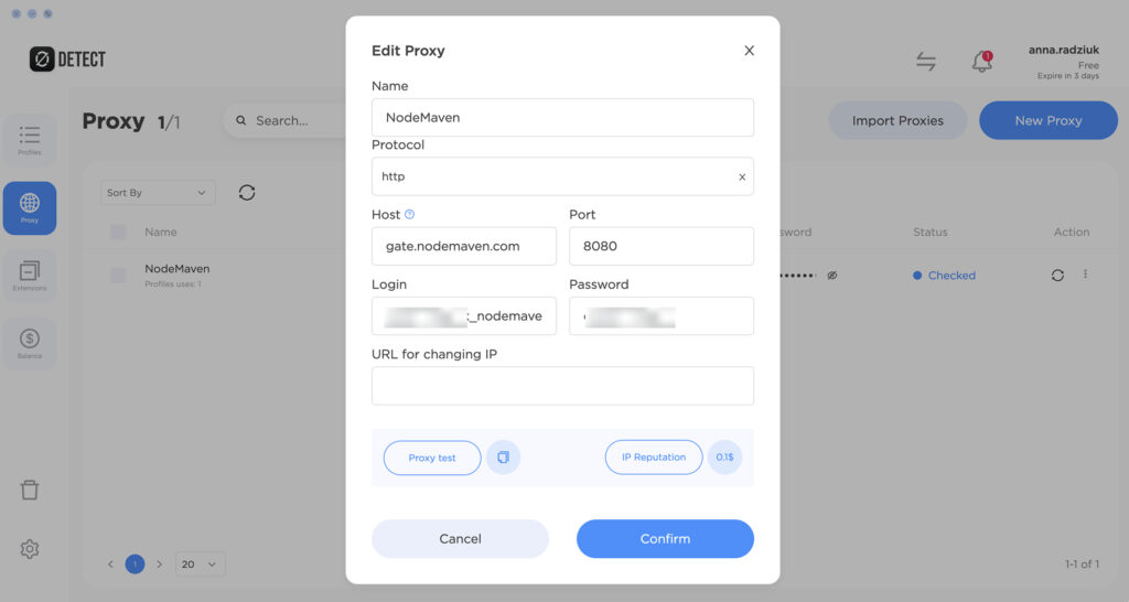 1. Add Proxy to 0DETECT: Open your browser profile settings in 0DETECT, choose “Add Proxy,” and paste in your NodeMaven credentials.