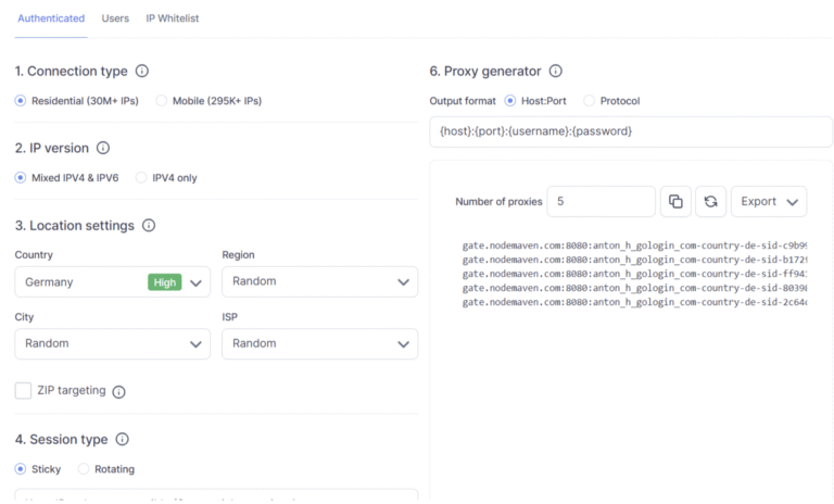 4. In your NodeMaven Dashboard, copy the proxy credentials — login/password, protocol (HTTP or SOCKS5), and session type/location.