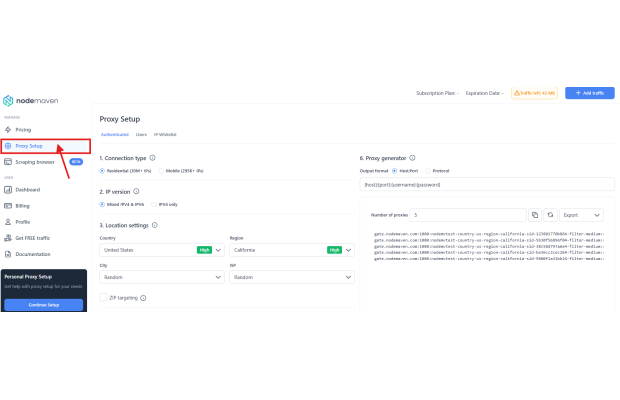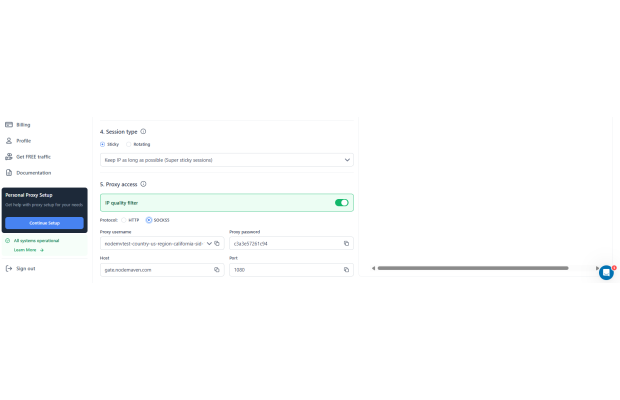 Go to your Proxy setup section in your dashboard and choose your location settings, session type and SOCKS5 protocol.
